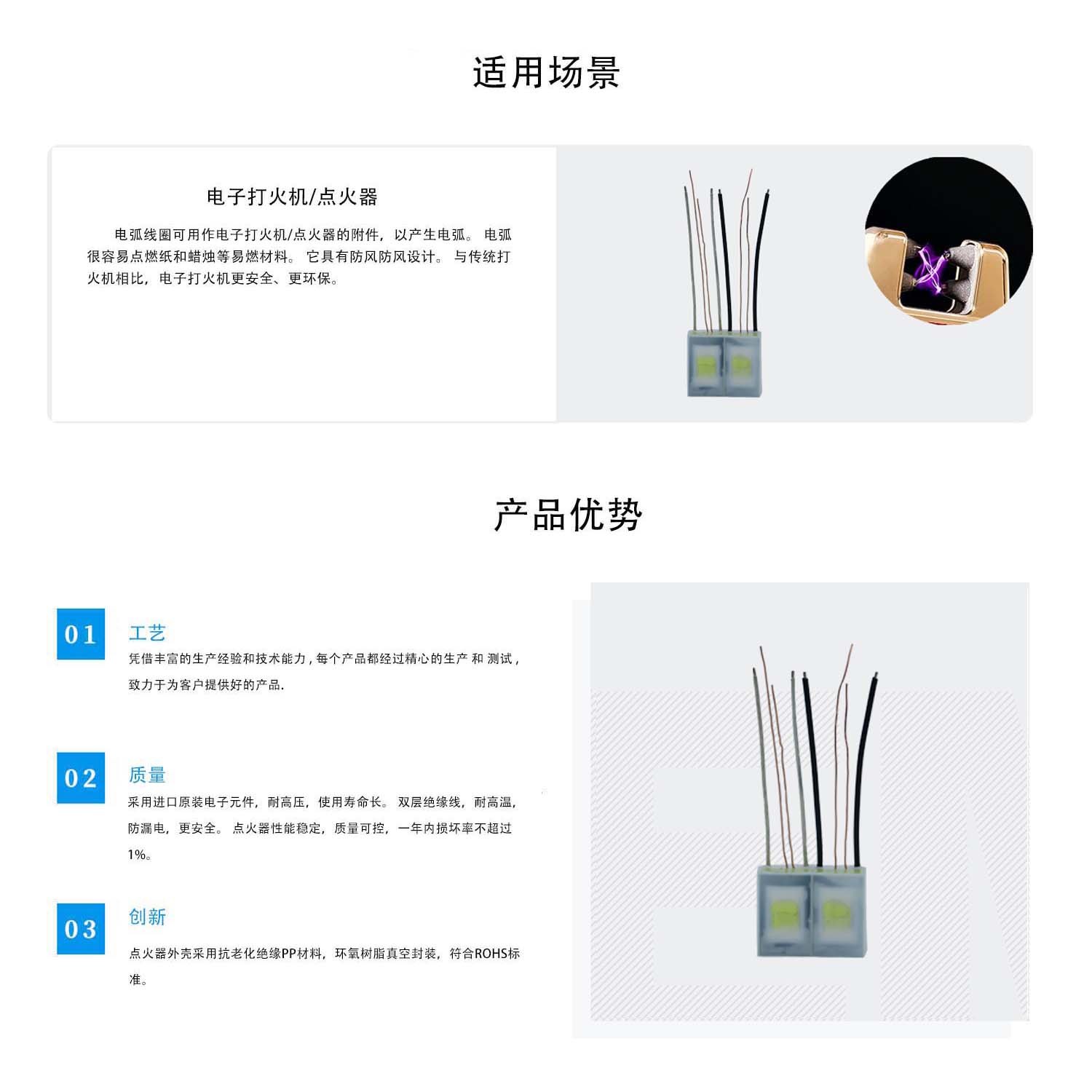 輸入電壓:3.7V 輸出電壓:8-8.2KVDC 工作頻率:18-20KHZ 電弧距離:6mm 輸入線長(zhǎng):40mm 輸入線徑:Φ0.55±0.05mm 銅絲線 輸出線長(zhǎng):40mm 輸出線徑:Φ1±0.05mm 透明鐵氟龍線 尺寸:20.6×7.9×15mm 重量:10.2g